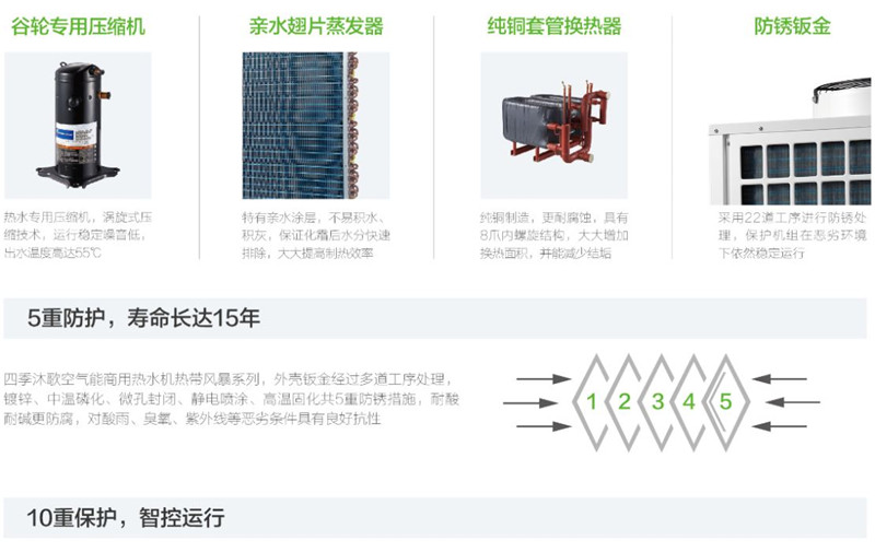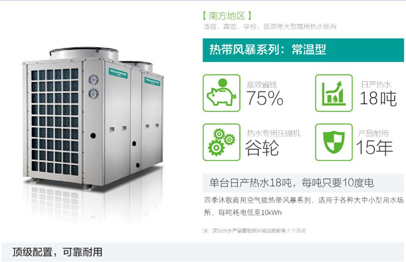 四季沐歌商用空氣能熱帶風暴低溫型系列,最低運行溫度達-15℃,單臺日產水量18噸,每噸耗電低至10kWh