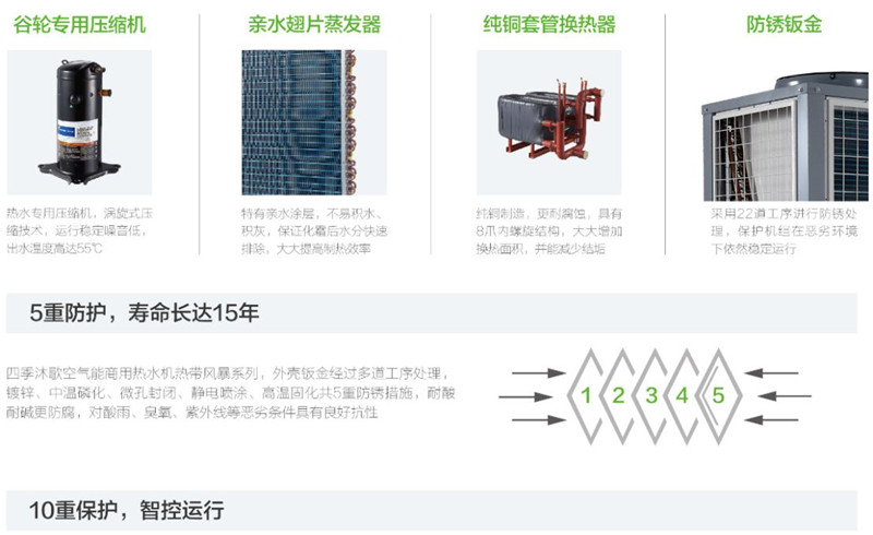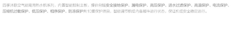四季沐歌商用空氣能熱帶風暴低溫型系列,產品型號覆蓋15P-30P不等,最低運行溫度達-15℃,單臺日產水量最高達62噸,每噸耗電低至10kWh