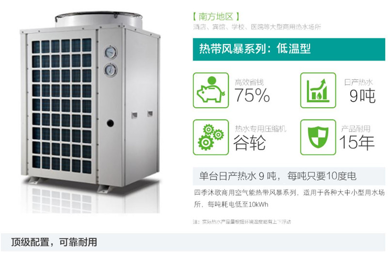 四季沐歌商用空氣能熱帶風暴低溫型系列,產品型號覆蓋5P-10P不等,最低運行溫度達-15℃,適用于長江流域各種大中小型用水場所,單臺日產水量最高達9噸,每噸耗電低至10kWh